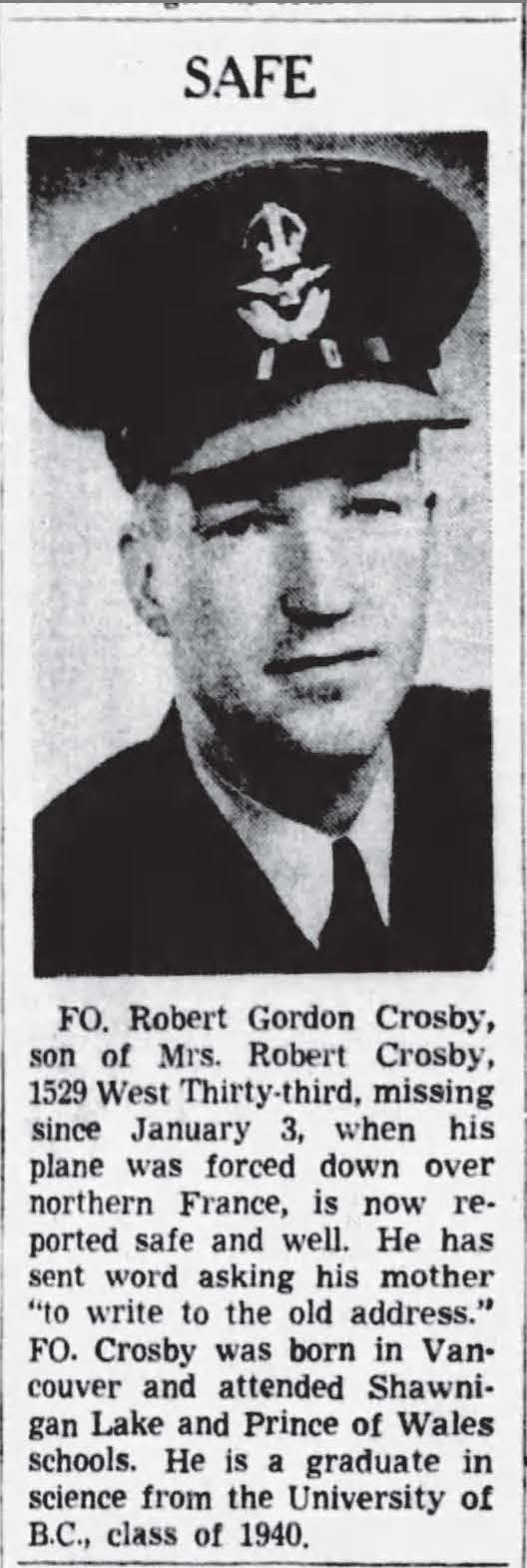 Born in Vancouver, BC, Crosby enlisted in his hometown on September 12, 1940. He was a geologist prior. He received his commission in December 1942. He was hit by flak, abandoned his aircraft (Typhoon Mk 1B JP446) and evaded capture. Crosby was mentioned in despatches and earned the DFC April 3, 1945 with effect from March 23, 1945.
