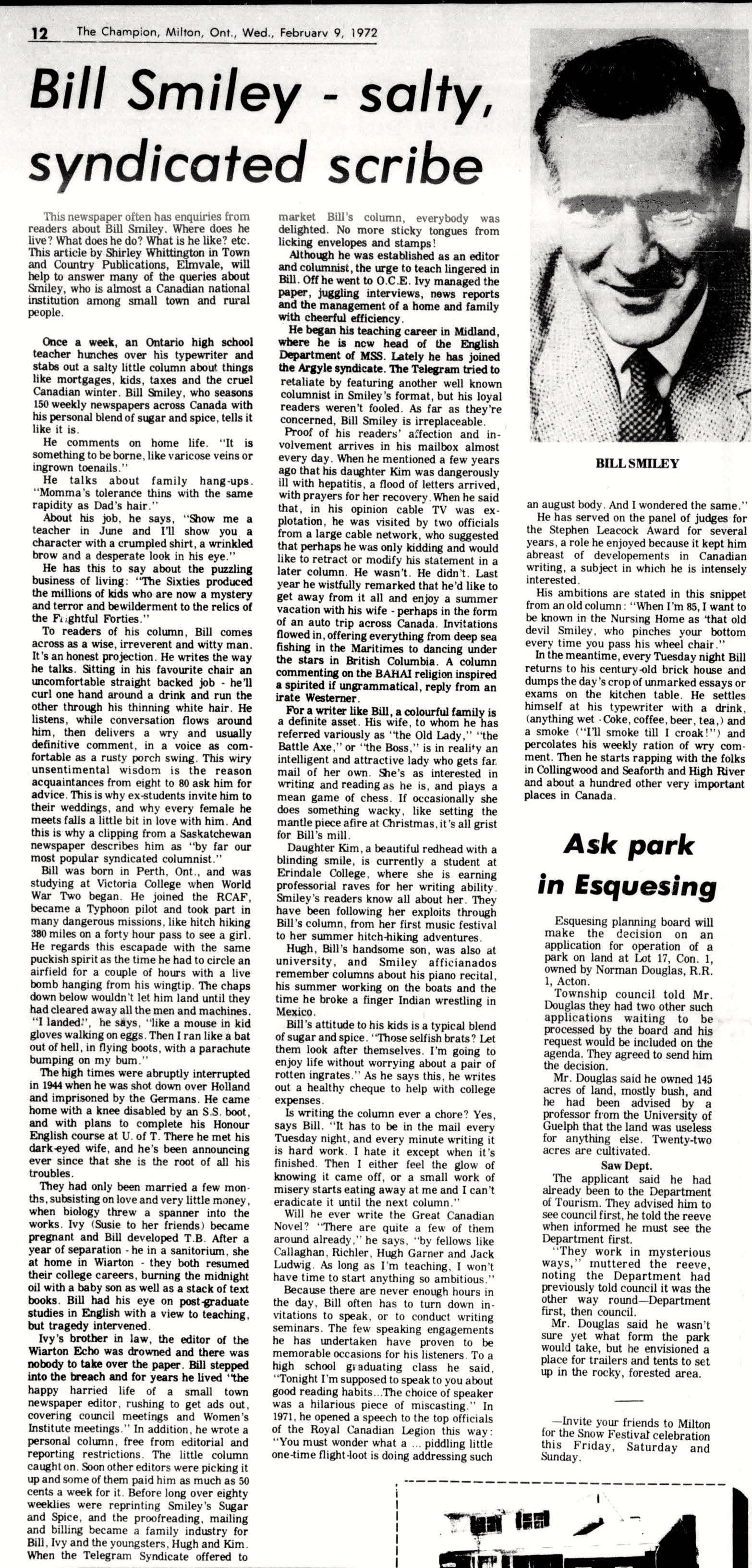 Smiley became a high school teacher and wrote a popular syndicated newspaper column from 1960 to 1985. See images for more information. He died in 1987 at his home in Midland, Ontario. He was predeceased by his wife Sue. They had one daughter, Kim and one son, Hugh. There was an annual Bill Smiley Essay Contest on the Human Spirit open to all Canadian high school students as a tribute to Bill Smiley who was the head of the English department in the Midland High School where he had taught after leaving the newspaper business. He was a graduate of the University of Toronto, in Hons. English and spent eleven years as editor and publisher of the weekly Wiarton, Ontario Echo.