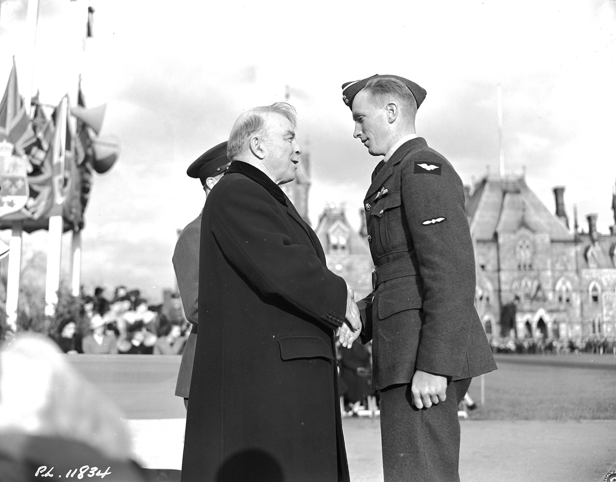 PL-11834 24 October 1942 #2 S.F.T.S. Uplands On., Wing Presentation, Wings presentation to No.2 S.F.T.S. Uplands, Ont. graduates by Prime Minister Mackenzie King on Canada's Parliament Hill at Ottawa, October 24, 1942. This was the first of its kind to be held in the shadow of the Parliament Buildings. Martin Pederson, Hawarden, Sask.